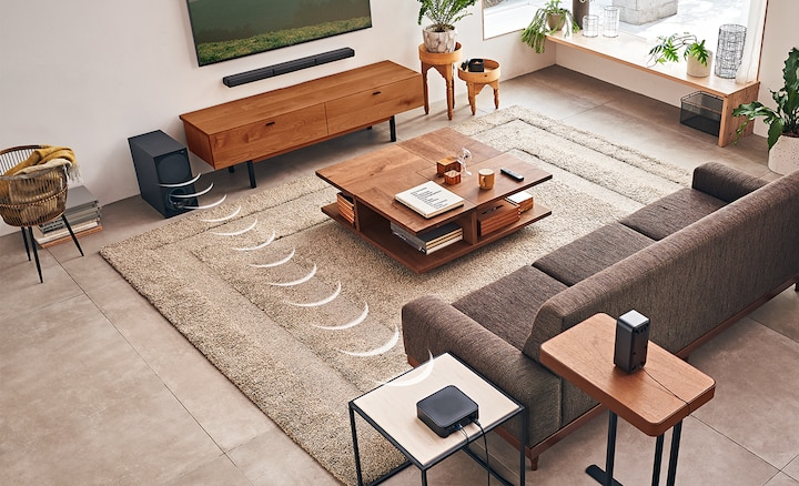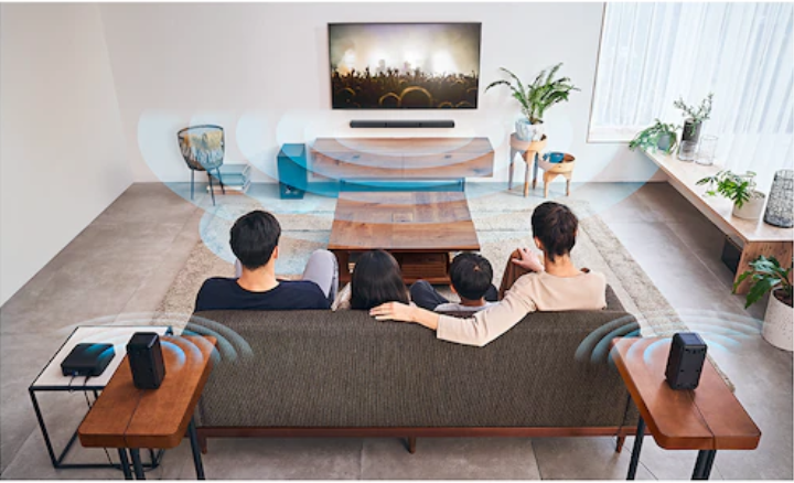 Bộ khuếch đại không dây cấp điện cho các loa sau, nên không có dây nào cản trở giữa phía trước và phía sau phòng. Loa subwoofer và loa thanh cũng dùng chung một kết nối nguồn duy nhất, do đó hệ thống có thể truyền tải âm thanh rạp hát mà không bị vướng víu hay phức tạp.